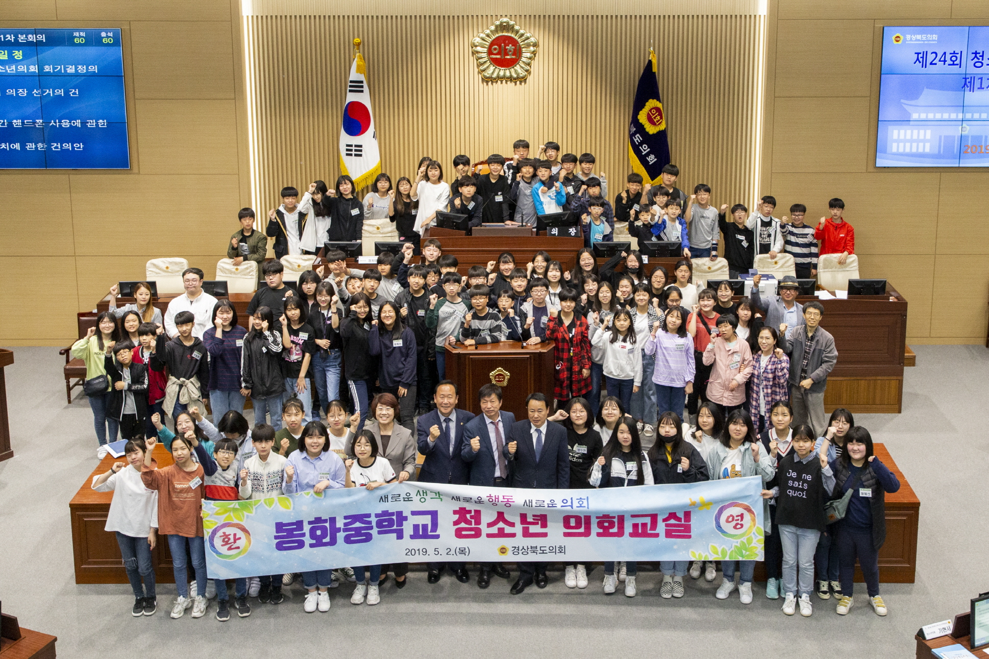 | 경상북도의회(의장 장경식)는 5월 2일 도의회 본회의장에서 봉화중학교 1학년 학생 94명을 대상으로 제24회 경상북도의회 청소년 의회교실을 개최했다.
