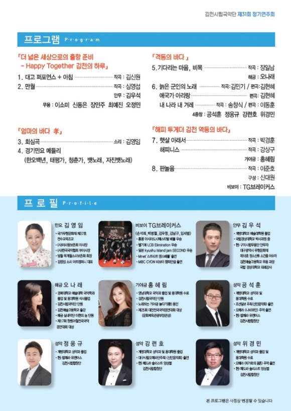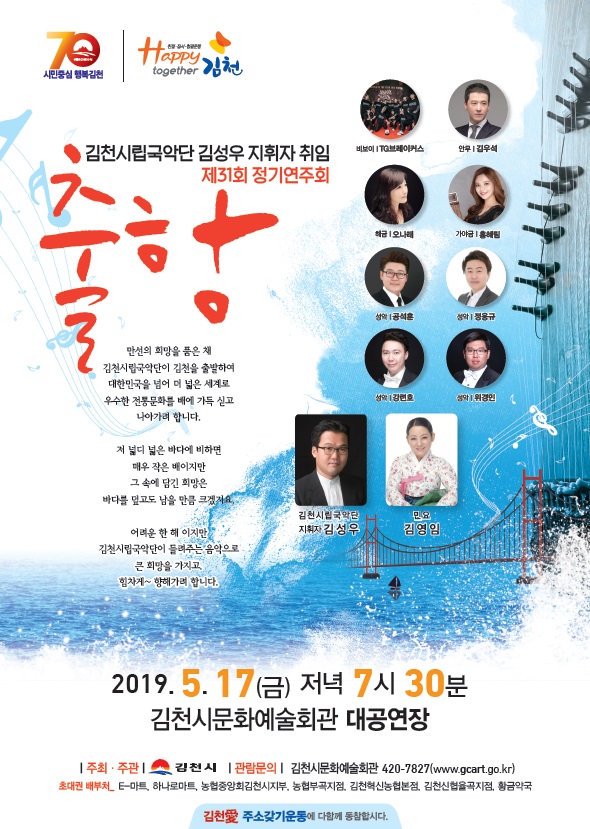 | 김천시문화예술회관(관장 김금숙)에서는 5월 17일(금) 오후 7시 30분 대공연장에서 김천시립국악단 제31회 정기연주회를 개최한다.