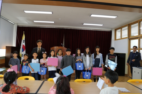본교 김기윤 교장선생님은 “지난 27일에는 제20회 졸업생들이 졸업 50주년 기념행사시 ‘크로스 가방’을 전교생에게 사 주셨는데 총동창회에서도 어린이날을 기념하여 어린이들이 좋아하는 그림도구세트를 사 주신 것에 깊이 감사드리며 앞으로 후배들이 밝고 건강하게 자랄 수 있도록 여러 선생님들과 함께 최선을 다 하겠다.” 라며 감사의 인사와 교육적 포부를 밝혔다.
