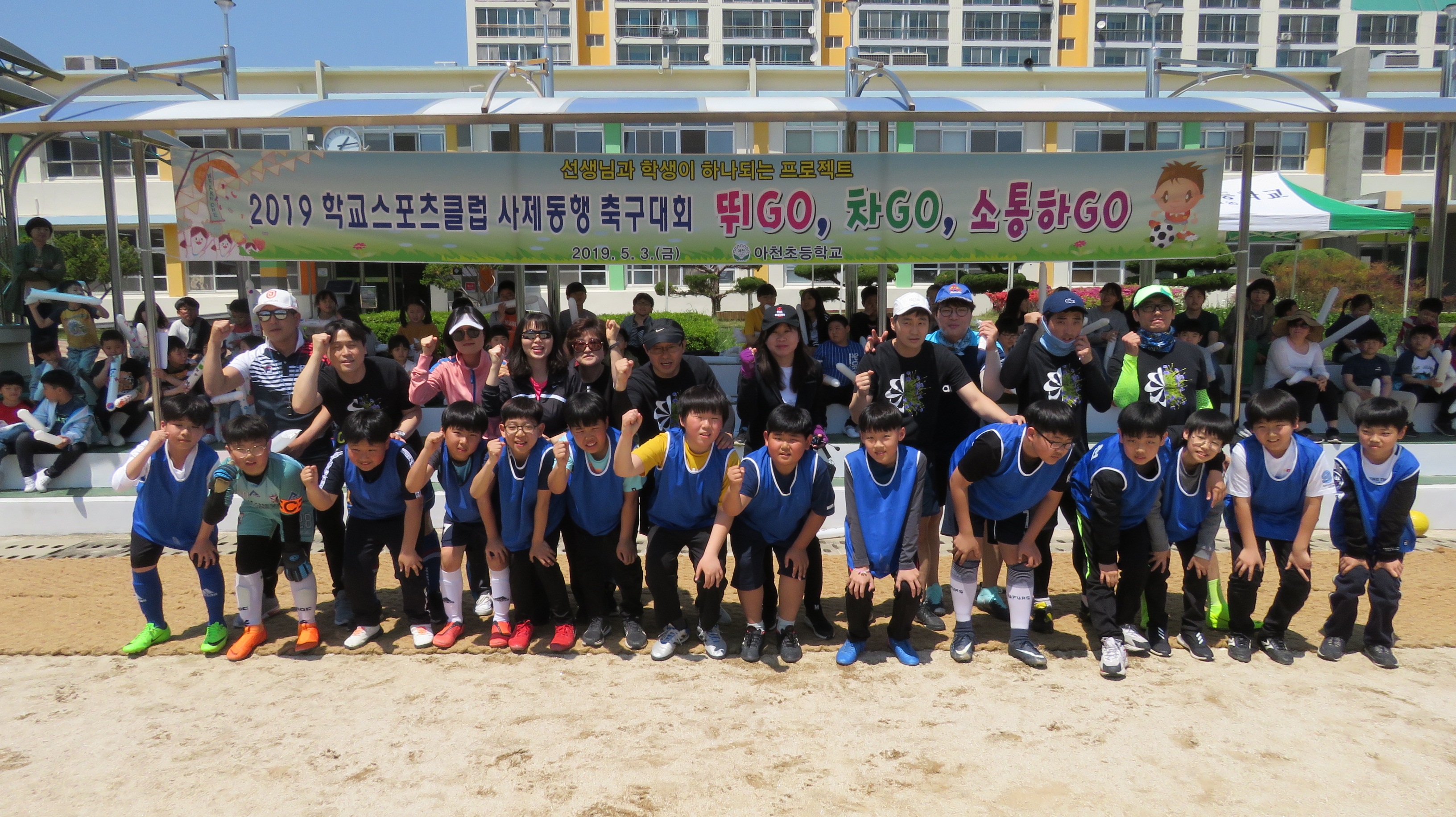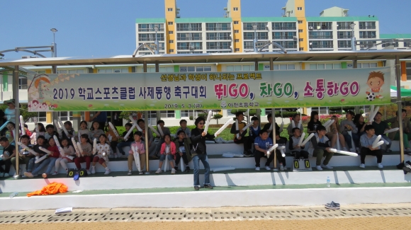 | 아천초등학교(교장 이용옥)는 5월 3일 금요일 운동장에서 전교생과 전교직원의 응원 가운데 2019 학교스포츠클럽 사제동행 축구 대회를 가졌다. 페어플레이 정신으로 사제간에 서로 격려하고 박수를 보내는 훈훈한 시간을 가졌다.