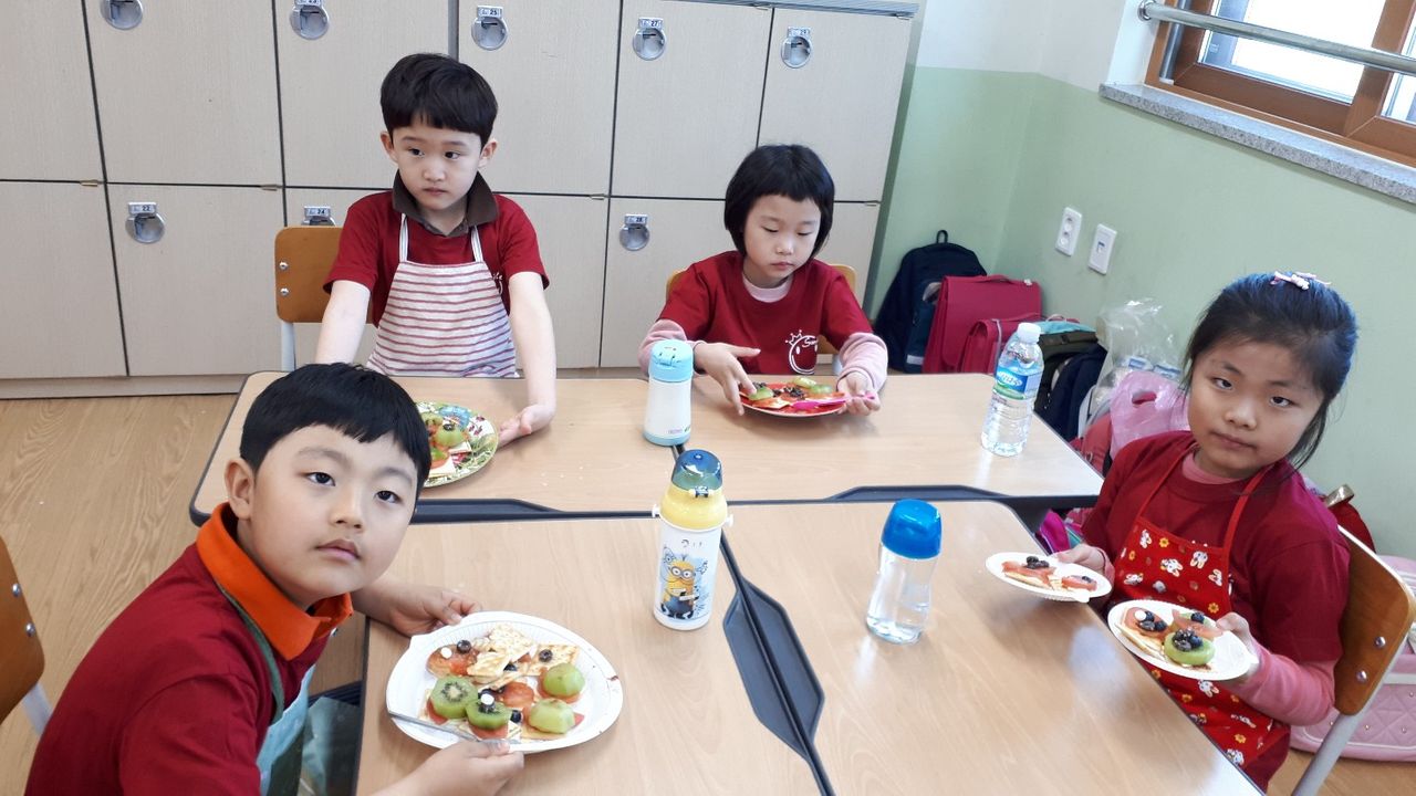 이날 요리는 학년 수준에 적합한 카나페 만들기로 함께 결정하고 재료를 준비하여 고사리 손으로 만들고 먹었다. 음식을 자신의 손으로 만드는 아이들의 표정이 진지하였고 즐거움이 가득했다.