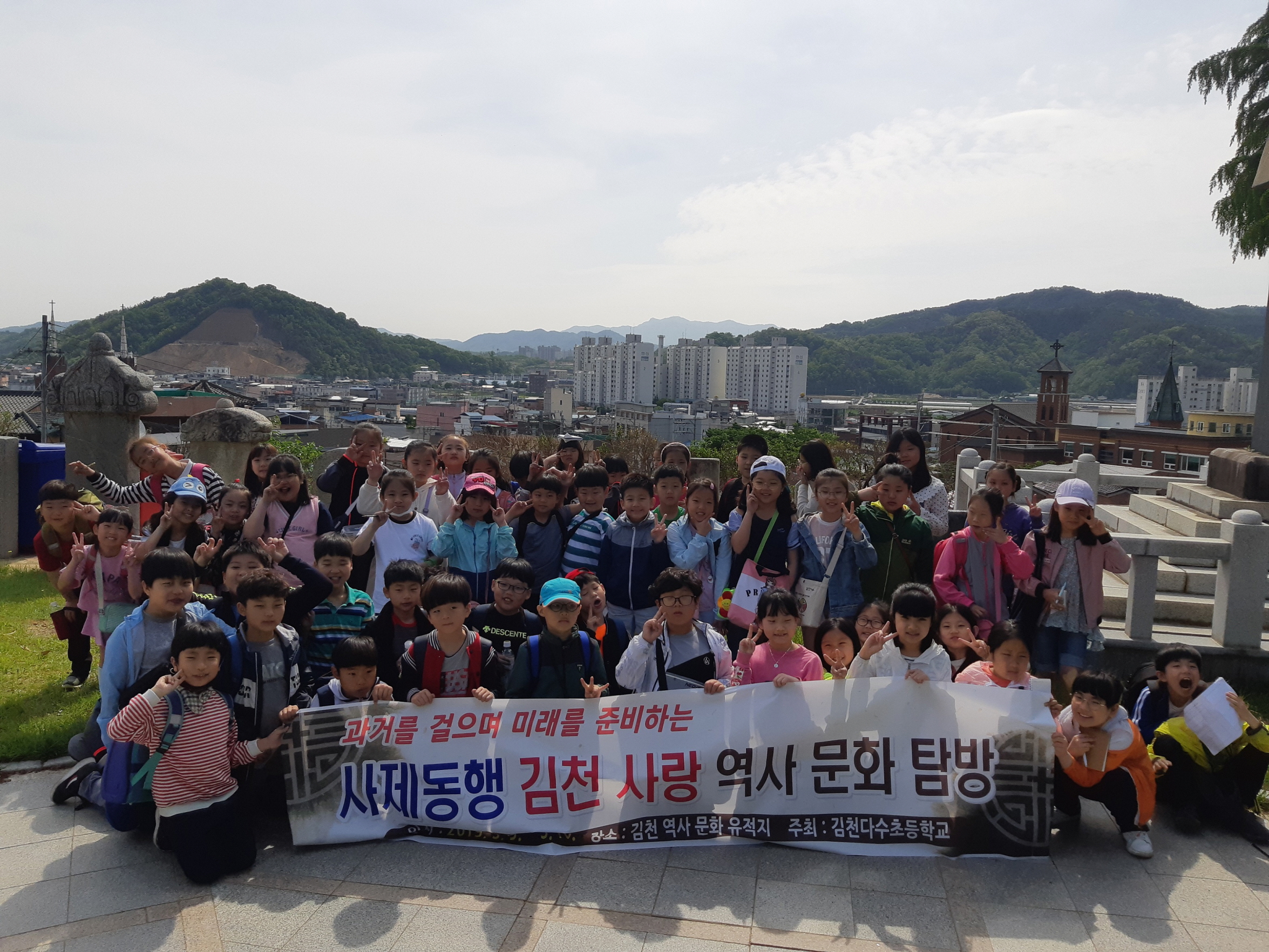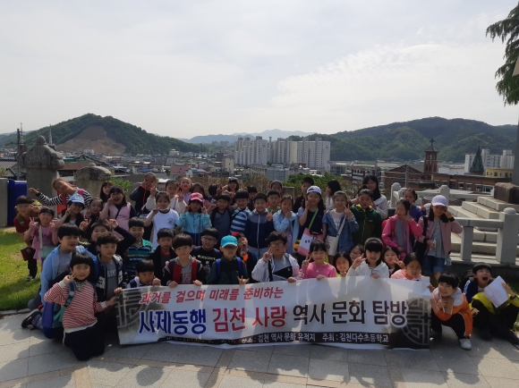| 김천다수초등학교(교장 김한수)는 5월 9일 3학년 58명을 대상으로 학교 중점 교육의 한 꼭지인 「지역문화탐방을 통한 온새미로 지역사랑 교육」의 실현을 위하여, 지역교과서에서 배우고 익힌 우리 고장의 역사에 대하여 직접 답사해 보고, 조상들의 숨결을 느껴보고자 ‘사제동행 김천사랑 역사 문화 탐방’행사를 실시했다.