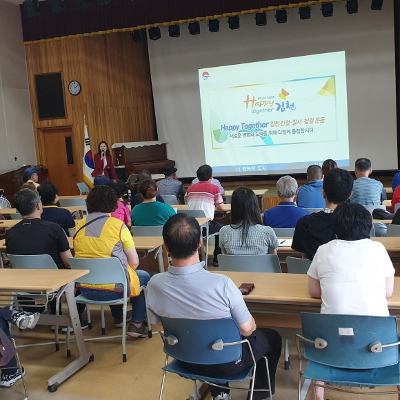 이번 교육은 유나현 전)아나운서의 강의로 시민이 모두가 행복한 김천시를 만들기 위한 우리 일상생활에서 실천할 수 있는 친절·질서·청결 실천과제를 중심으로 교육을 실시하였고, 교육에 참석한 60여명의 대상자들은 교육 후 Happy Together 김천운동 실천을 동참하는 결의 다짐도 하였다.
