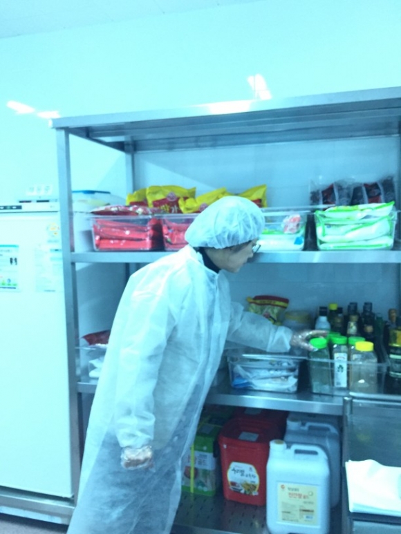 김천교육장(마숙자)은 위생관리가 철저한 조리현장에 피해를 주지 않기 위해 위생모와, 위생복, 마스크를 끼고 위생화로 갈아신고 신발 밑바닥부터 소독하는 등 조리실 입장부터 외부인 출입을 금지하는 급식현장의 원칙을 철저히 준수하고 해썹시스템을 기반으로 조리온도, 시간 조리공정과정이 제대로 이뤄지는지 확인하고, 급식소 조리기구 청결상태 등 구석구석을 점검했다.