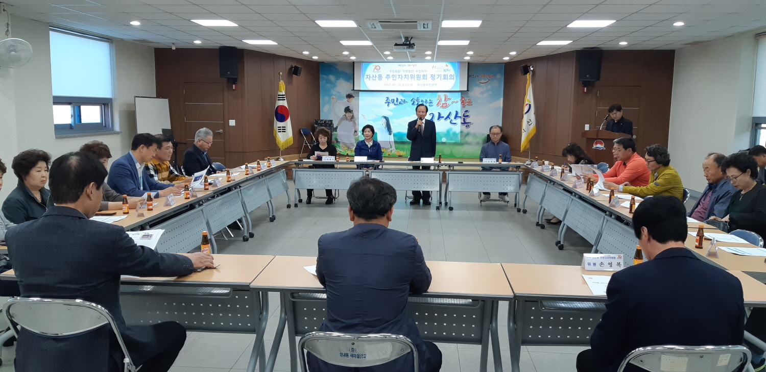 제1기 주민자치위원회는 지난 4월 8일 위촉되어 첫 정기회를 개최했으며, 이날 회의에서는 자산동 자치위원회 운영세칙을 제정하고 가결한 후, 주민자치센터의 향후 운영방안에 대한 심도있는 토의시간을 가졌고, 자치위원회 주관으로 5월 25일 개최되는 「Happy together 짐전장 빛 축제」의 성공을 위하여 위원들의 적극적인 참여와 맡은 바 역할에 대한 각오를 다졌다.