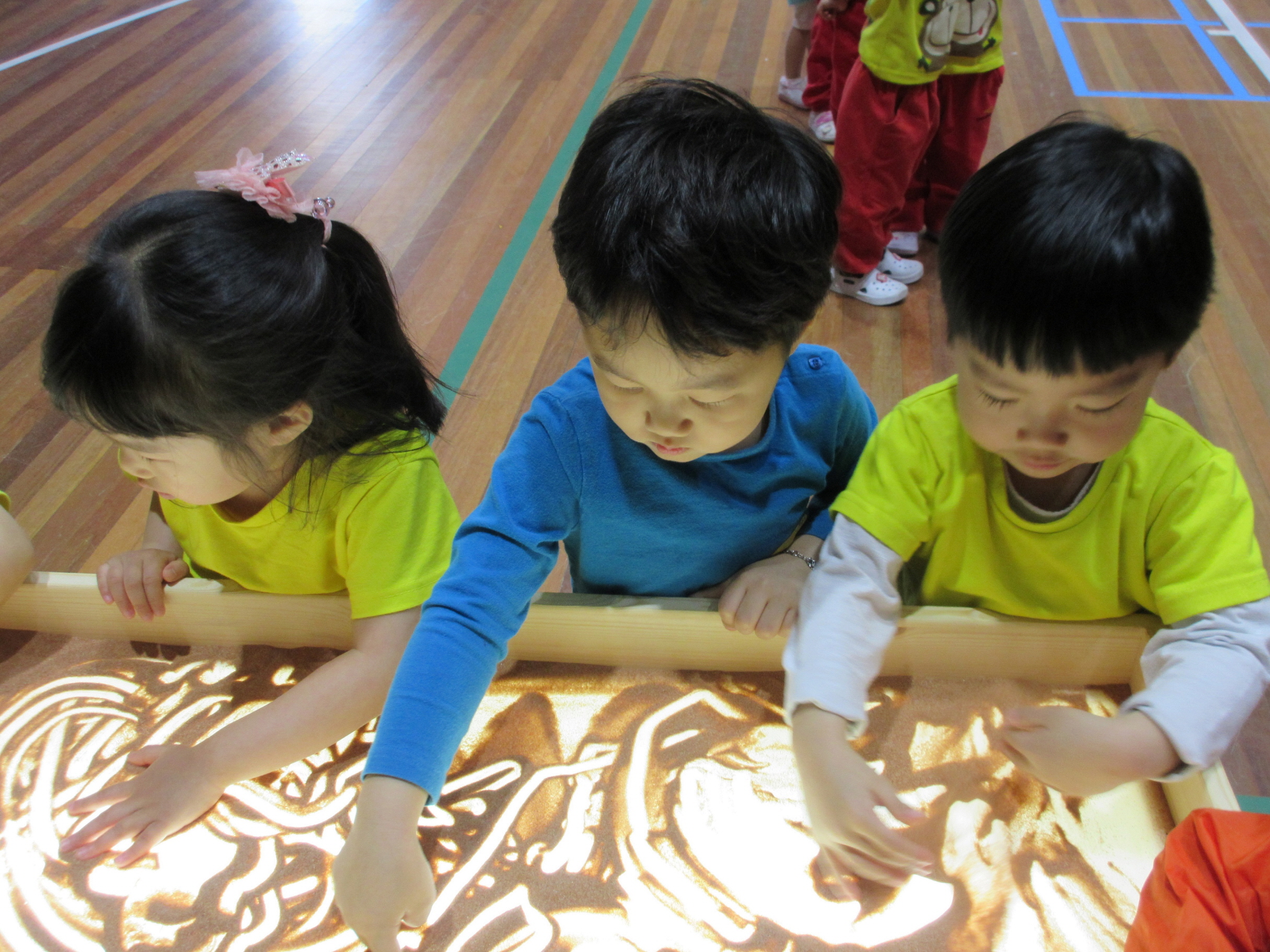 거인과 함께 찍는 VR사진찍기는 동화 속에 들어온 것 같은 실시간 자기 모습에 유아들의 호기심와 흥미를 불러일으켰고 무엇보다 아이들이 빛과 모래로 그림을 그리는 샌드아트를 가장 재미있어하였다.