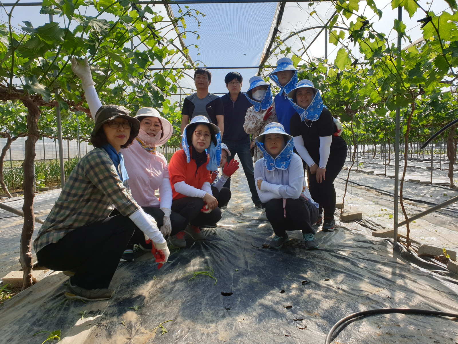 이날 평생교육원 직원 8명과 소속 여성새로일하기센터 직원 3명 등 11명은 아침 일찍부터 1,400㎡의 포도 과수원에서 농가주의 교육을 받은 후 포도순 제거 작업에 포도알 같은 구슬땀을 흘렸다.