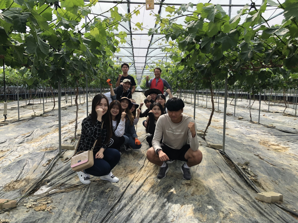 | 김천대학교 총학생회(대의원장 신종철)는 영농인력감소와 고령화로 영농기에 일손이 부족해 어려움을 겪고 있는 농촌에 작은 도움이라도 되기 위해 지난 5월 25일 대항면 소재의 포도 재배농가를 방문하여 포도순 따기 등 일손돕기 봉사활동을 실시했다.