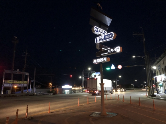 따라서 김천의 관광지인 직지사와, 영남대로 도로명을 표기한, 도로명판을 함께 표시해, 이정표 역할 뿐만 아니라, 도로명주소 사용을 보다 적극적으로 홍보 할 수 있는 기회가 되었으며, 도로명주소의 다 방향 안내 및, 도심의 야간 경관이미지 개선에 효과적이다.