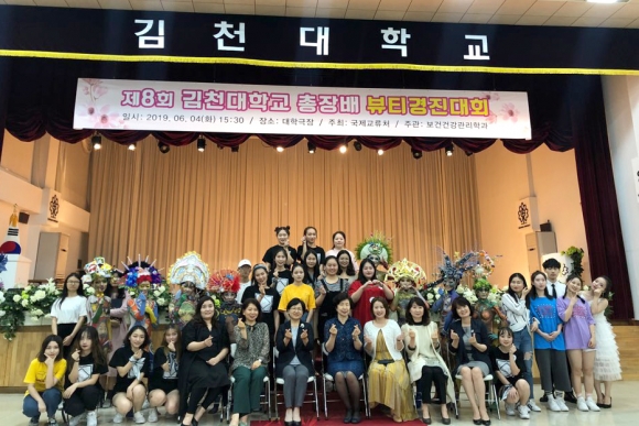 | 김천대학교(총장윤옥현) 보건건강관리학과 뷰티케어전공에 재학 중인 중국유학생들은 지난 6월1일(토) 세종대학교 컨벤션홀에서 (사)한국분장예술인협회가 주최하고 고용노동부와 한국산업인력공단에서 후원한 “2019년 무한도전 뷰티콘테스트”에서 국제부 아트마스크부문에서 대상(FURONG, LIXIAOMIN), 웨딩메이크업 부문 대상(LIU YEYANG, LIANGMIN)과 아트마스크부문 금상(JIANGLONG), 웨딩메이크업 부문 금상(YEKEQIN), 웨딩메이크업 부문 은상(JIANGLONG), 속눈썹 연장부문 은상(LIU YEYANG)을 수상하였다. 이번 대회에는 김천대학교와 자매대학인 사천위생회복직업대학에서 교수와 학생들이 참여하여 뷰티실력을 자랑하였다. 본 대회에는 22개 종목에 1,100여명의 학생이 출전해 기량을 겨뤘다.