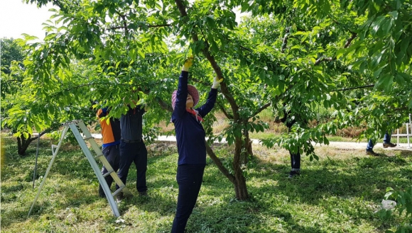 대부분의 직원들이 농사일이 서툴러 자두 열매 솎는 방법을 배워가며 일하느라 작업 속도는 더뎠으나, 부족한 일손에 조금이라도 보탬이 되고자 구슬땀을 흘려가며 손을 바쁘게 움직였다.
