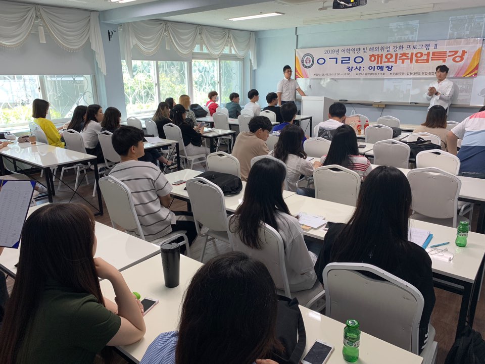 | 지난 6월 5일 김천대학교 취업·창업지원센터 주최로 재학생을 대상으로 “해외취업 동향”특강이 실시하였다. 2017년 취업포털 잡코리아와 한식재단이 20세 이상 성인남녀를 대상으로 조사한 결과, ‘기회가 되면 해외취업을 하고 싶다’는 응답자가 10명중 9명(약90%)으로 조사되어 해외취업은 재학생들이 많은 관심을 보이는 분야로 알려진다.