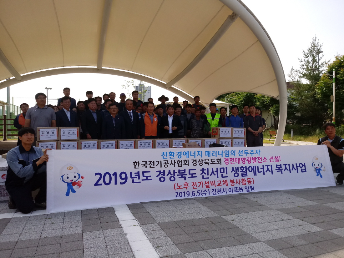 | 경상북도와 김천시(시장 김충섭)가 주최하고 김천시 전기공사협회(회장 김영산)가 주관하는 노후전기시설 교체 봉사활동이 6월 5일 아포읍에 거주하는 기초생활수급자 및 독거노인 등 40가구를 대상으로 실시되었다. 매년 정기적으로 진행되는 봉사활동은 에너지 소외계층과 사회 취약계층의 전기재해를 예방하고 안전한 생활을 영위하도록 전기공사협회의 재능기부로 이루어져 더욱 의미를 더하고 있다.