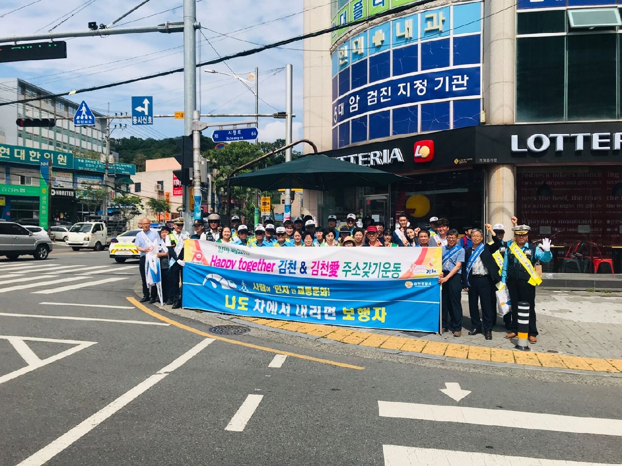 | 김천시는 지난 6월 10일 이마트 사거리에서 한국교통안전공단, 김천경찰서, 모범운전자회, 녹색어머니회, 경북안전생활실천시민연합 등 60여명이 참석한 가운데 「Happy Together 김천」운동 및 교통사망사고 예방을 위한 교통안전 캠페인을 실시하였다.