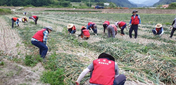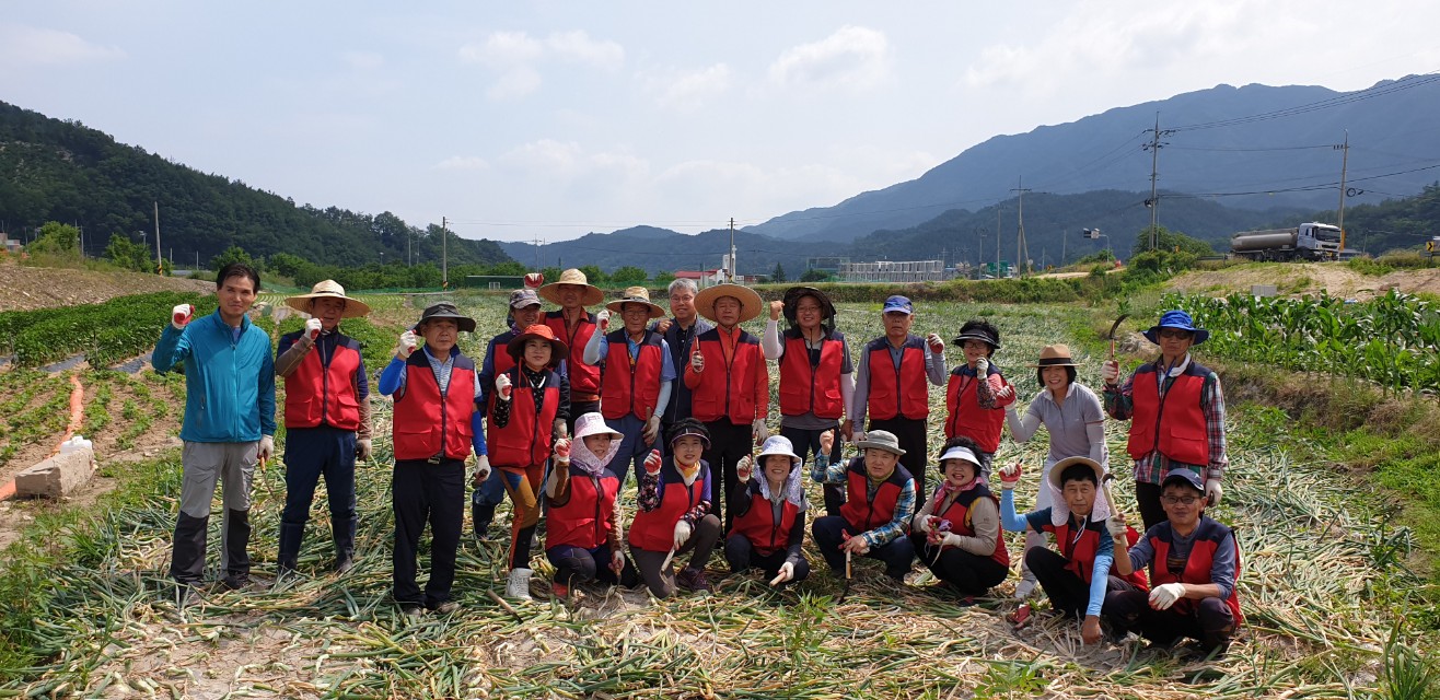 | 양파값 하락과 일손이 부족하여 양파 수확에 농가들이 어려움을 겪고있다는 소식을 듣고 지난 15일 대곡동통장협의회(회장 김영식)에서 두 팔 걷어 부치고 일손 돕기에 나섰다.