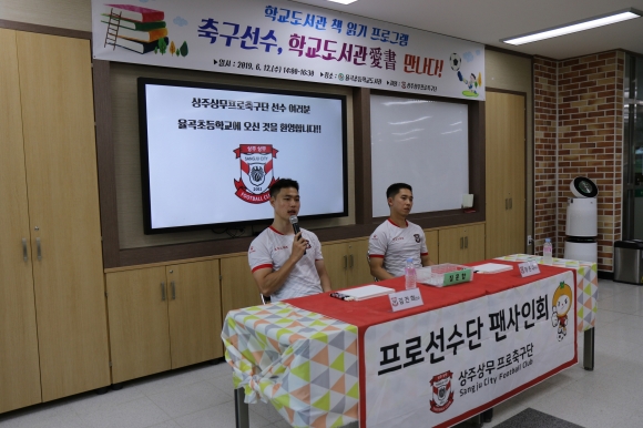 | 율곡초등학교(교장 이삼영)는 6월 12일 상주상무프로축구단의 지원으로 『축구선수, 학교도서관愛書 만나다』행사를 실시하였다.