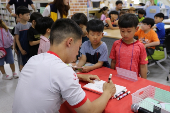 | 축구선수와의 대화에서는 학생들이 미리 질문한 질문지를 축구선수가 뽑아 답변해주었는데, “골을 넣으면 기분이 어떤가요?”“축구선수도 공부를 많이 해야 하나요?”라는 질문에 축구선수들이 답변을 해주어 학생들의 호기심을 해결할 수 있는 시간이었다. 사인회에서는 100명이 넘는 학생들이 참가하였는데, 장은규 선수께서 학생들에게 아이스크림을 깜짝 선물로 사주셔서 학생들에게 더욱 행복한 시간을 선사해주셨다.