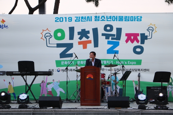 | 김천시(시장 김충섭)는 지난 15일 강변 공원에서 “2019년 청소년 어울림마당 High’s Expo”선포식을 가졌다. 선포식에는 남추희 행정복지국장님을 비롯한 각급 학교 지도 선생님, 일반시민 및 청소년들이 참석하여 축제를 응원하고 축하해 주었다.