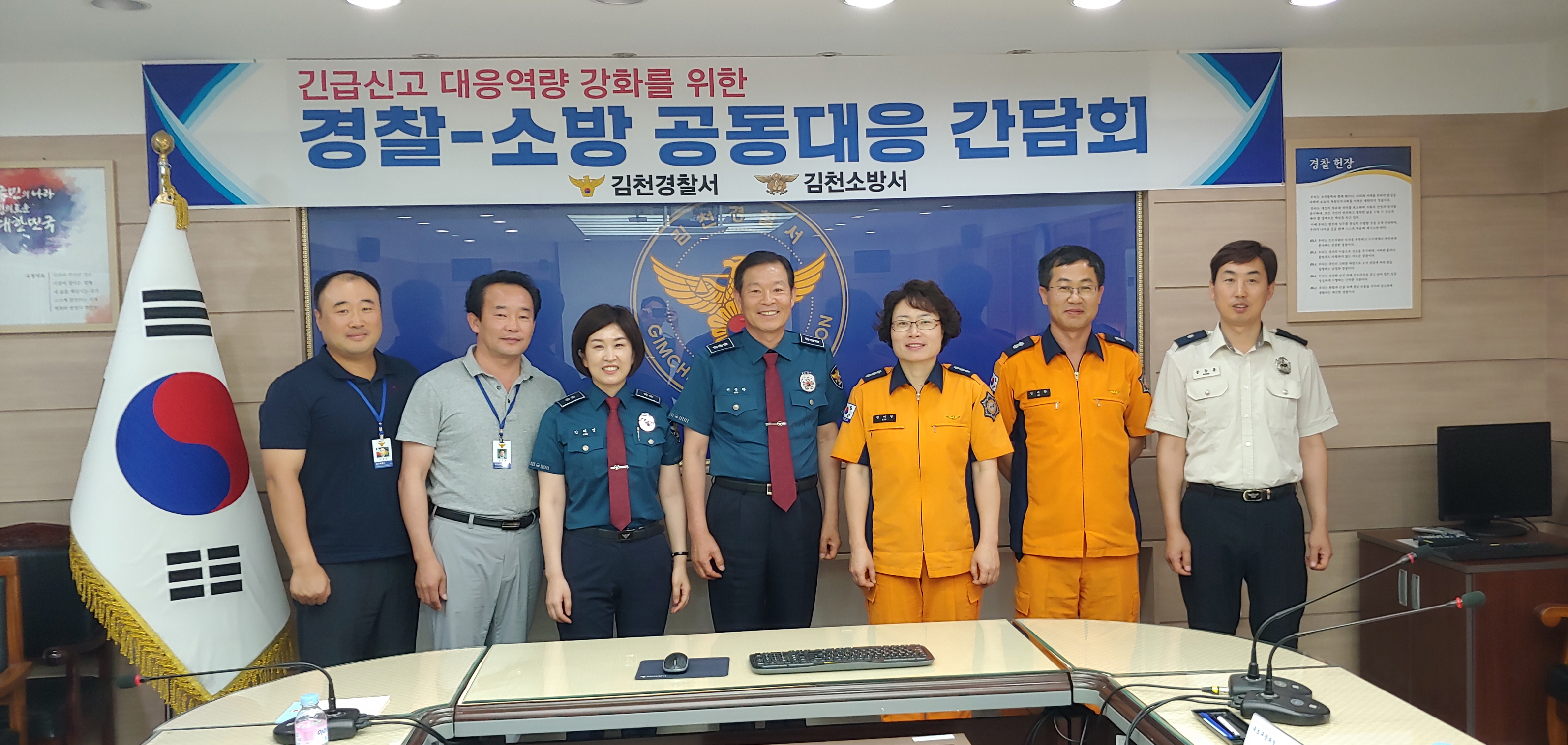 | 김천경찰서(서장 임경우)에서는 6월 19일 11시 김천경찰서 2층 열린방에서 생활안전과장·112상황팀장 등 5명, 김천소방서 구조구급과장 등 4명이 참석한 가운데 『긴급신고 대응 역량 강화를 위한 경찰·소방 공동대응 간담회』를 개최하였다.