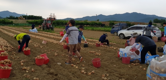 개령면 양파수확에 일손 보태