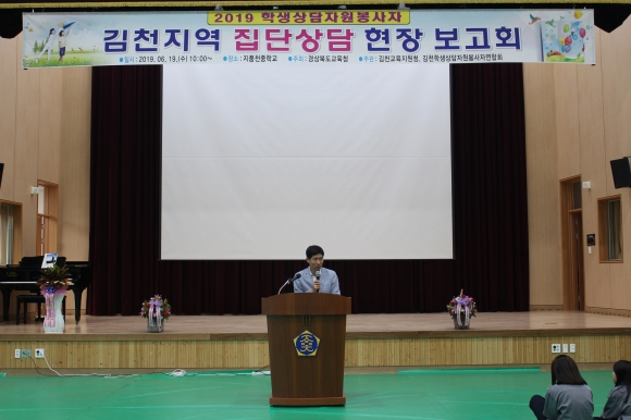 | 경상북도김천교육지원청(교육장 마숙자)에서는 6월 19일(수) 지품천중학교에서 ‘2019년 김천지역 학생상담자원봉사자 집단상담 현장 보고회’를 실시하였다. 이는 집단상담 실시 현장을 공개․ 참관함으로써 상담의 의미와 필요성에 대해 생각해 보고 평가․반성하는 시간을 가지기 위한 것으로 김천 관내 초·중·고등학교 교감, 상담업무 담당교사, 각 지역 학생상담자원봉사자연합회 회원 등 100여명이 참석한 가운데 이루어졌다.