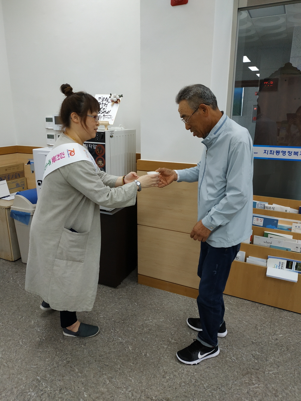 동행정복지센터 직원과 주민 자원봉사자로 구성된 지좌동 행복민원도우미는 방문 민원인에게 먼저 다가가 인사하고, 도와드릴 일이 있는지 살피며 바쁜 주민들에게 무인민원발급기 사용법을 안내하기도 했다.