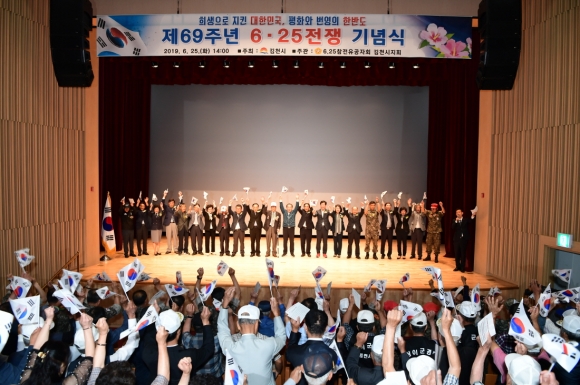 | 김천시는 6월 25일 김천문화회관 공연장에서 대한6.25참전유공자회 김천시지회(회장 임상도) 주최로 보훈단체장, 참전유공자 및 그 유족, 국가유공자, 시장, 국회의원, 의장, 학생, 시민 등 450여명이 참석한 가운데 「제69주년 6.25 전쟁 기념식」을 가졌으며 호국보훈의 달을 맞이하여 국가 안보와 평화 수호의 의지를 더욱 다지는 자리를 마련했다고 밝혔다.
