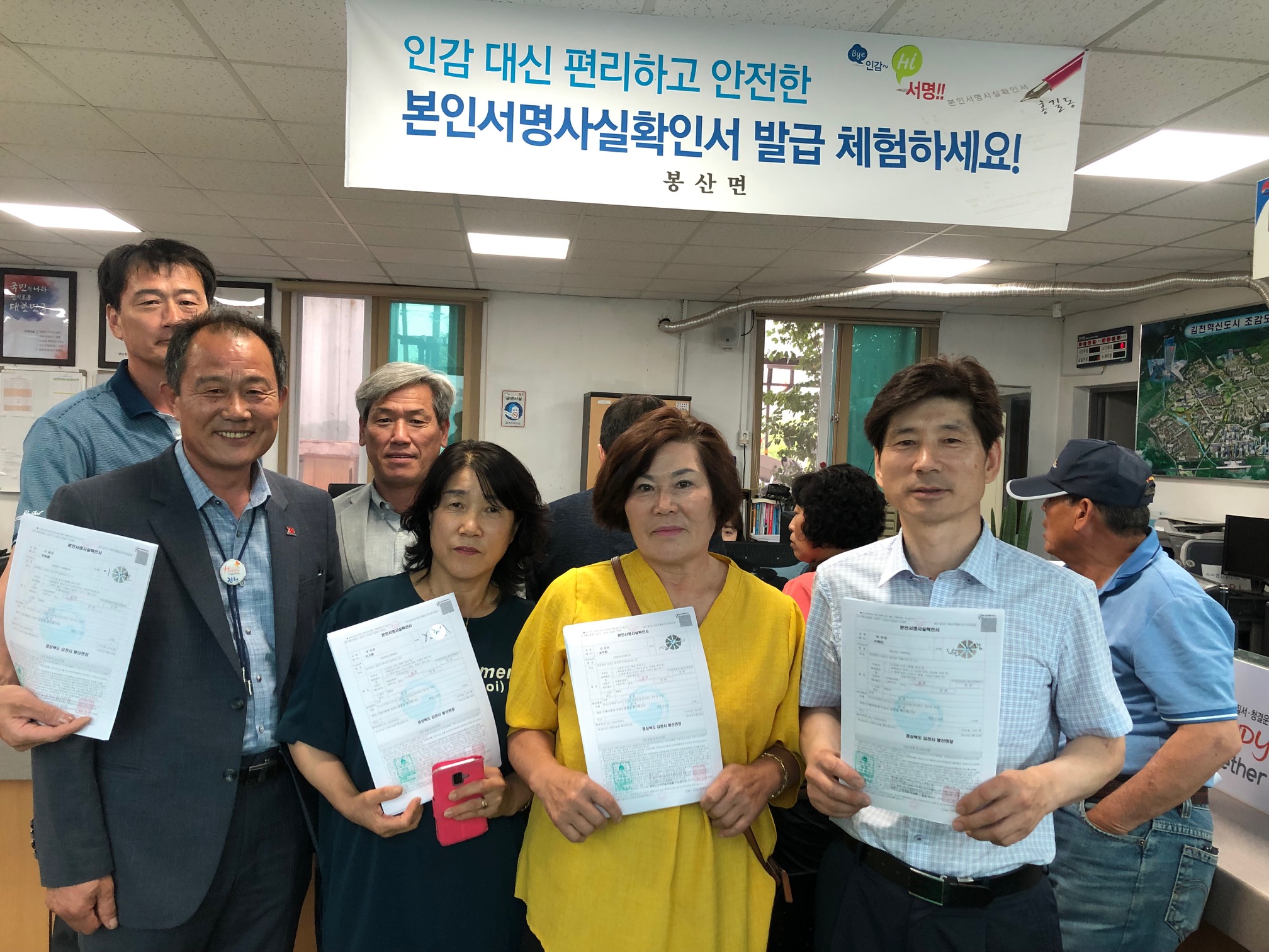 조수만 봉산면장은 “본인서명사실확인제도는 지난 2012년부터 인감증명제도를 대체하기 위하여 시행되었으나, 인감증명서 대비 본인서명사실확인서의 발급률은 7.75%(2019.5월 기준)로 저조한 편이다. 주민자치위원님들의 발급 체험을 통해 면민에게 본인서명사실확인제도의 장점을 홍보하는 계기가 되길 바란다.”고 말했다.