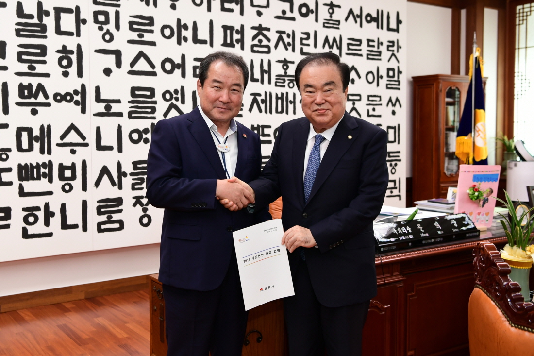 문희상 국회의장은 “시장님의 의견에 공감하며 국회 차원에서 할 수 있는 제도적 부분이 있다면 적극적으로 검토하겠다” 고 하여 김천의 다양한 지역 현안사업 추진에 탄력이 붙을 전망이다.