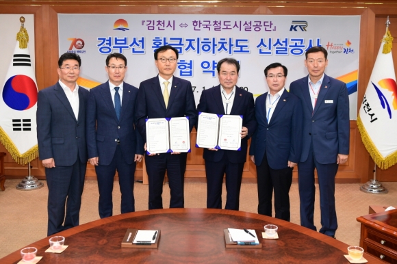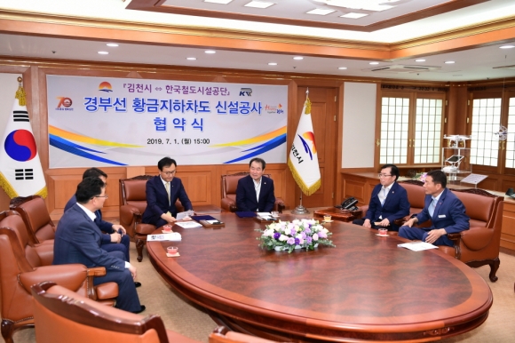 | 김천시(시장 김충섭)는 7월 1일 한국철도시설공단(충청본부)와 협약을 체결하고 경부선 철도로 단절되었던 황금시장과 중앙시장을 연결하는 경부선 황금동지하차도 신설공사를 시행한다고 밝혔다.