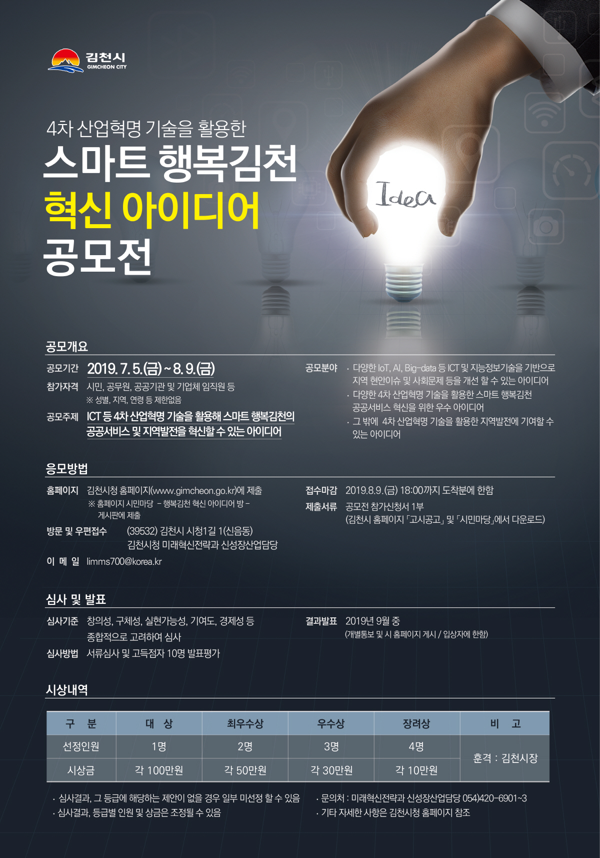 | 김천시는 오는 7월5일부터 8월 9일까지 4차 산업혁명 기술을 활용한 『스마트 행복김천 혁신 아이디어』를 공모한다고 밝혔다.