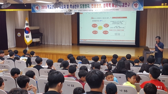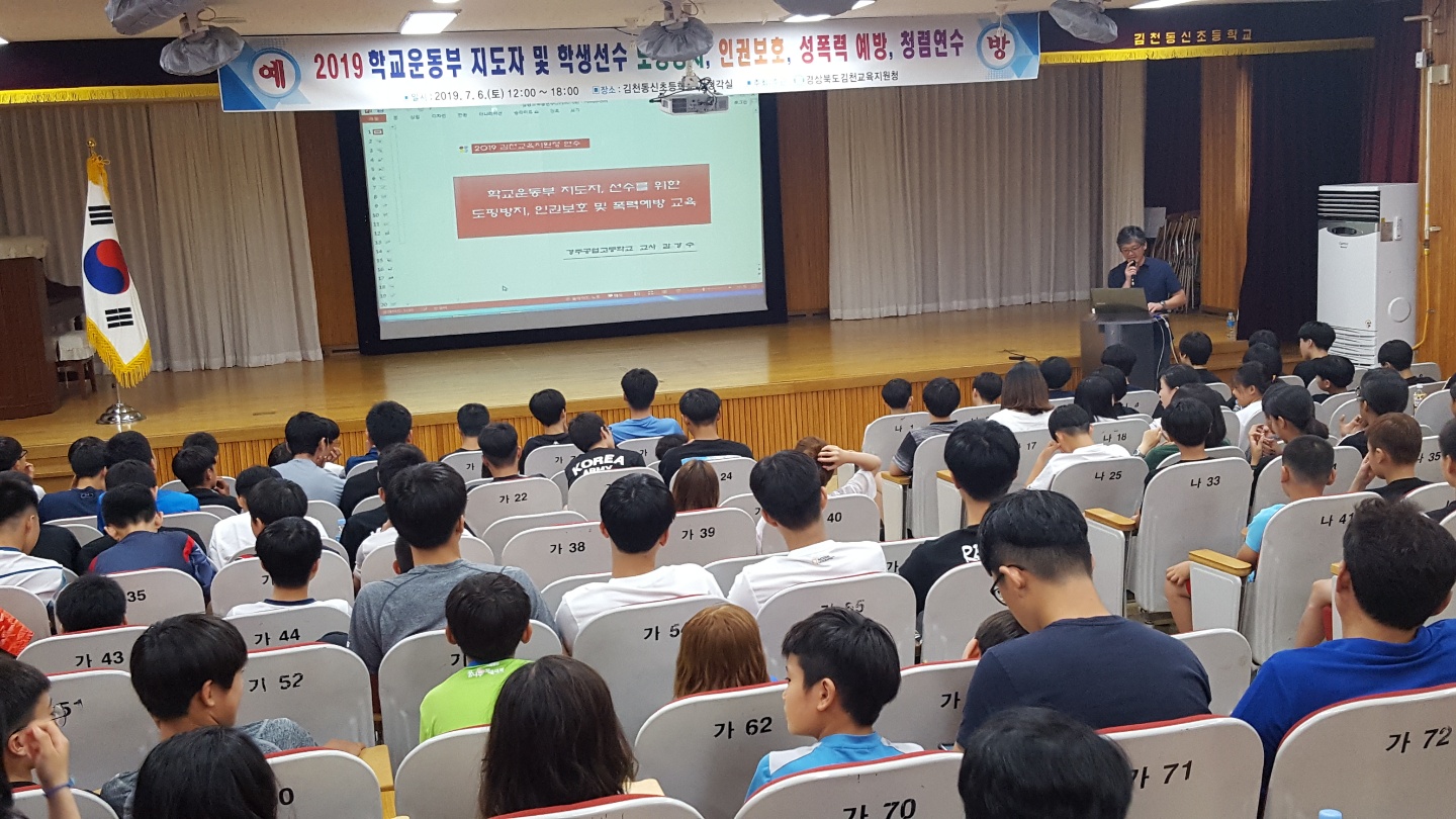 | 경상북도김천교육지원청(교육장 마숙자)은 7월 6일 김천동신초등학교 시청각실에서 김천 관내 초, 중, 고등학교 학생선수 및 학교운동부 지도자 100여명을 대상으로 도핑방지교육, 인권보호 및 성폭력예방 연수를 시행하였다.