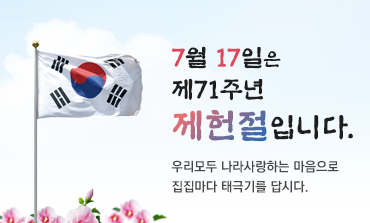 | 김천시(시장 김충섭)는 제71주년 제헌절을 맞이하여 대한민국 헌법 제정을 경축하고 시민들의 나라사랑 정신 함양과 자긍심 제고를 위해 전 시민 태극기 달기 운동을 적극적으로 전개한다고 밝혔다.