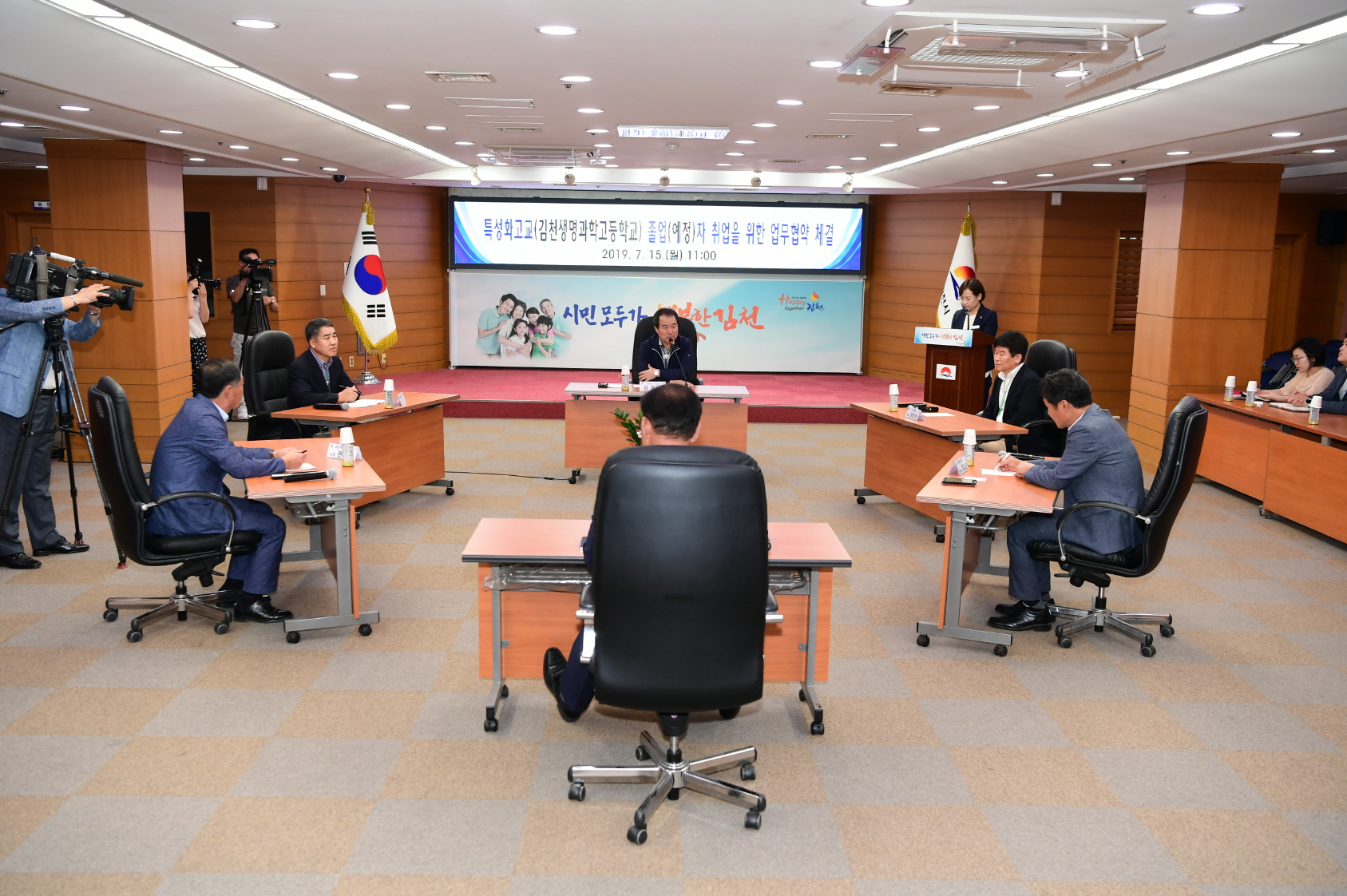 | 김천시(시장 김충섭)는 7월 15일 김천시청 2층 회의실에서 관내 특성화고교인 김천생명과학고등학교의 청년층 실업예방과 기업의 구인난을 해소하기 위하여‘특성화고교 졸업(예정)자 취업을 위한 업무협약’을 김천생명과학고등학교(교장 김세경), ㈜대정(대표 정동희), 롯데푸드(주) 김천공장(공장장 박대진), 김천시취업지원센터(소장 권동수) 관계자 20여명이 참석하여 체결했다.