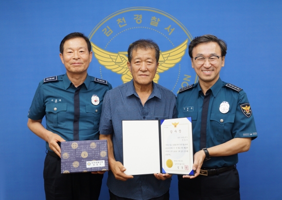 | 김천경찰서(서장 임경우)는 7월 16일 택시기사의 기지로 김천시 소재 모저수지 난간에서 자살을 시도하는 한 생명을 살릴 수 있도록 한 택시운전자에게 감사장을 전달했다.
