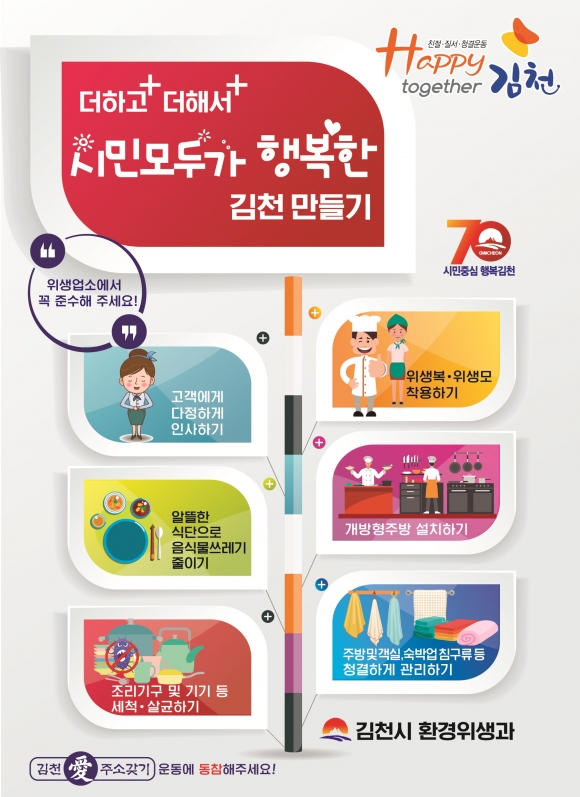 김준호 환경위생과장은 “김천시는 「Happy together 김천 청결운동」과 더불어 자체적으로 음식점 영업주 집합교육, 현장방문 컨설팅, 매월 10일 주방대청소의 날 운동 캠페인 등을 추진한 결과 경북 시부분 최고의 지정률이라는 성적표를 받았다고 말하여 음식점 영업주들이 음식점 위생등급제 지정에 적극적으로 동참해 줄 것을 당부한다.” 고 밝혔다.