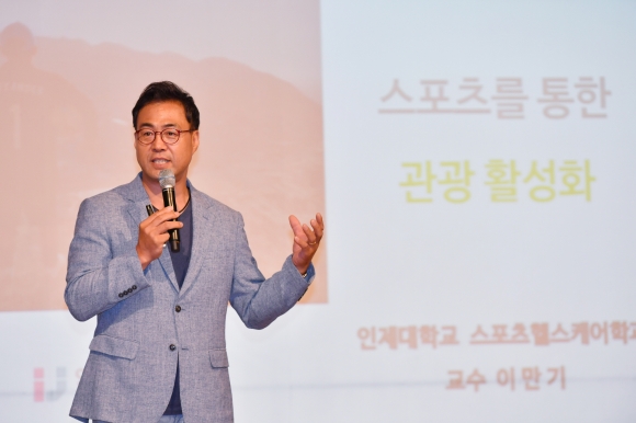 | 먼저 이날 스포츠를 통한 관광활성화라는 주제로 특강에 나선 이만기 교수는 “김천시는 어떤 도시보다 스포츠 인프라 구축이 잘 돼 있는 도시”라며, 세계 스포츠 관광도시와 미래 스포츠의 현황을 설명한 뒤 김천시가 스포츠 관광과 융합해 미래지향적 건강 도시로 나아갈 방안을 제시했다.