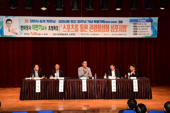 김천시 승격 70주년 및 김천신문 창간 30주년을 기념해 김천시체육회와 김천신문사 공동주최로 열린 이번 심포지엄에 시민 200여명이 참석한 가운데, 굴뚝 없는 산업이라 불리며 미래 100년의 주요 먹거리 산업으로 일컬어지는 관광과 스포츠의 융합을 통한 지역 발전 방안 모색에 나섰다.