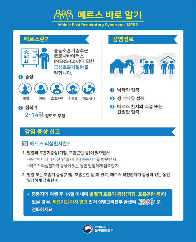아울러, 바이러스는 확산 속도가 빠르기 때문에, 지역사회로의 전파를 방지하는 것이 매우 중요하다. 메르스 발생 시 즉각 대응을 위하여 신속 진단을 위한 방역체계가 연중 운영되고 있으니, 귀국 후 잠복기 내 발열과 호흡곤란, 기침, 가래 등 메르스 증상이 의심되면, 의료기관 방문 전 반드시 보건소(☎ 421-2715), 질병관리본부 콜센터(☎1339)로 연락하여 적절한 조치방법을 안내 받기를 당부하였다.