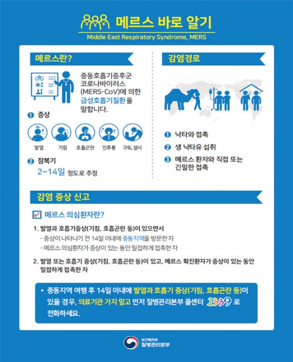 메르스는 2주간의 잠복기를 거쳐 낙타나 환자와의 접촉, 또는 호흡기 비말을 통해 감염되는 것으로 알려져 있다. 그러므로 기본적으로 손씻기, 마스크 착용, 기침예절 등 개인위생수칙을 준수하여야 하며 추가적으로 낙타접촉을 금지하고, 중동 현지 의료기관 방문을 자제하여야 한다.