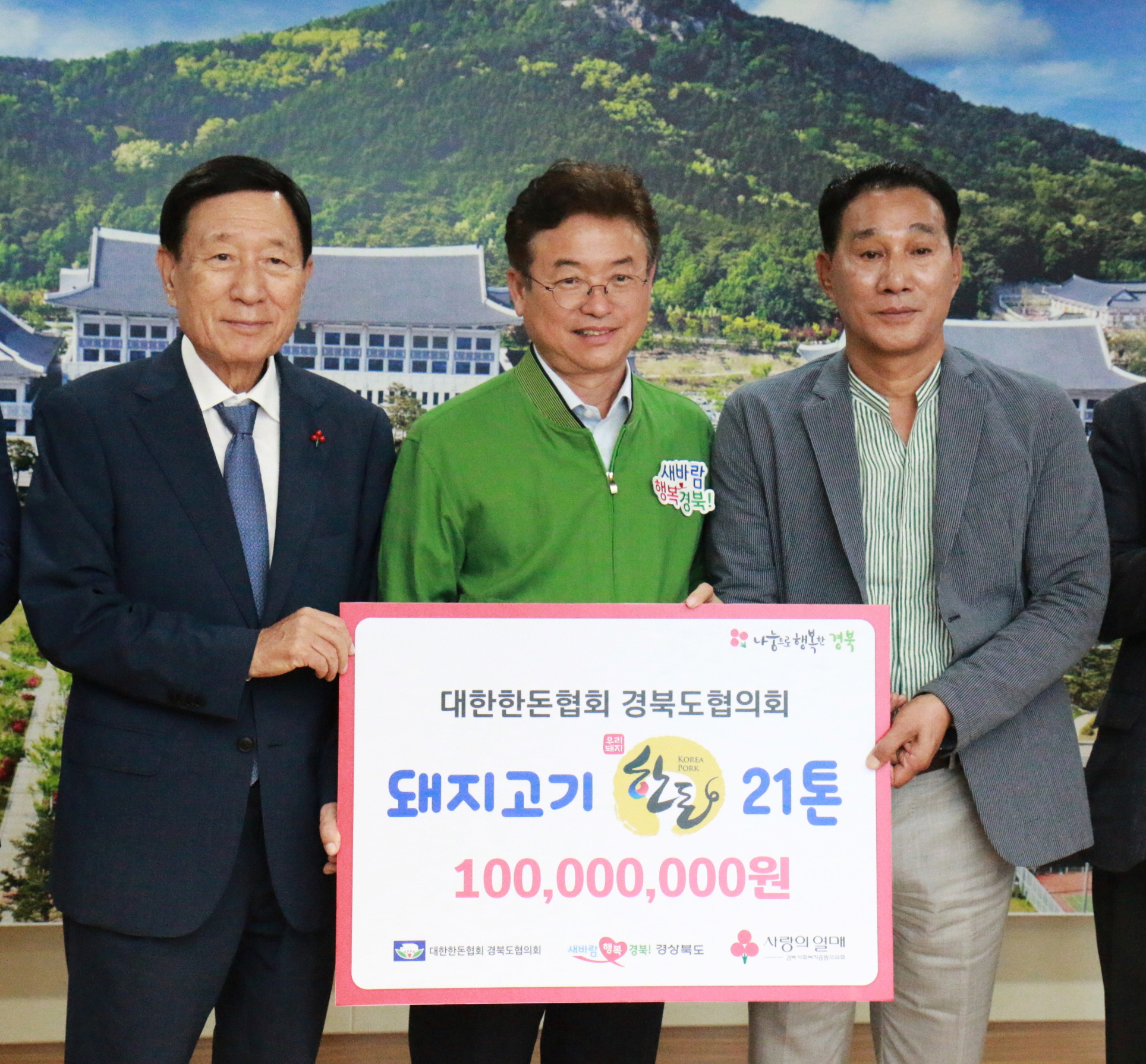 이 날, 경상북도지사 접견실에 열린 전달식에는 이철우 경상북도지사, 신현수 경북사회복지공동모금회장, 최재철 (사)대한한돈협회 경북도협의회장 등 관계자들이 참석했다.