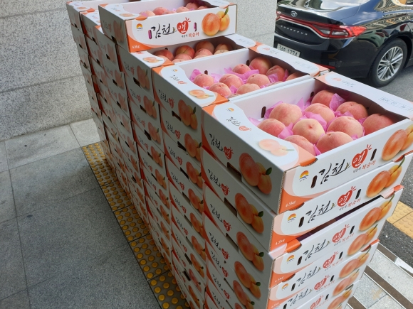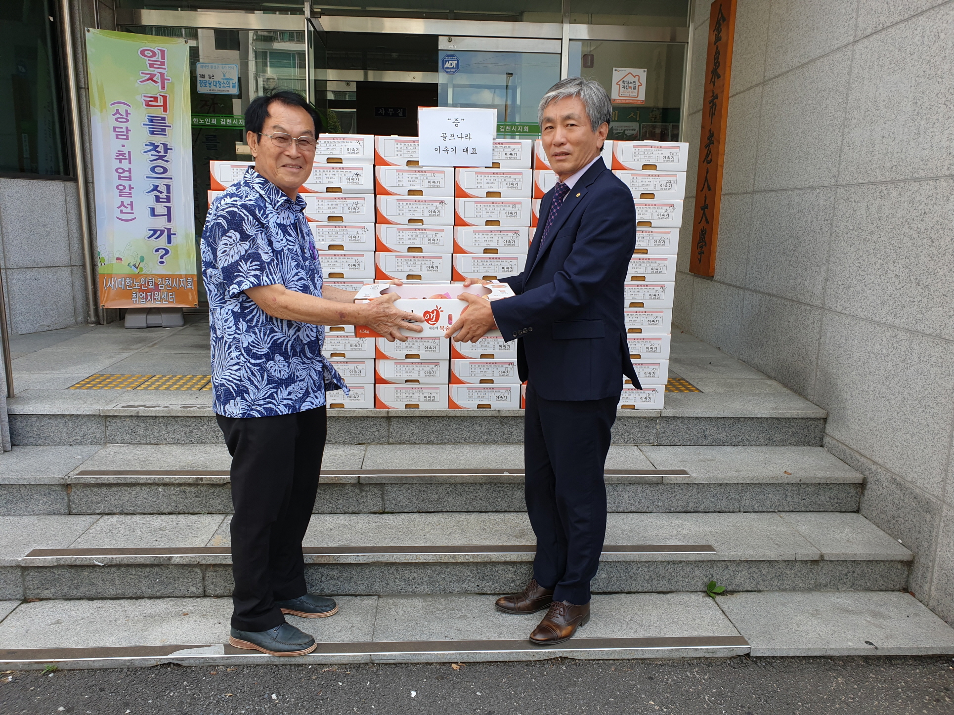 | 골프나라연습장 대표 이속기 (61세. 신음동)께서 대한노인회 김천시지회(지회장 이부화)에 복숭아 60상자를 전달하여, 동지역 60개 경로당에 무더운 여름철 어르신들에게 무더위속에서 웃음과 건강을 찾을 수 있도록 해주어 활기찬 경로당 분위기 조성을 해주었다