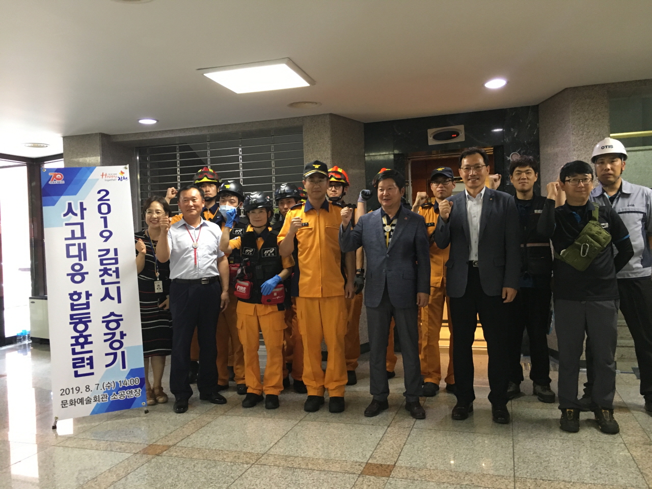 | 김천시(시장 김충섭)는 지난 8월 7일 김천시 문화예술회관 소공연장에서 김천소방서, 한국승강기안전공단과「승강기 사고대응 합동훈련」을 실시했다.