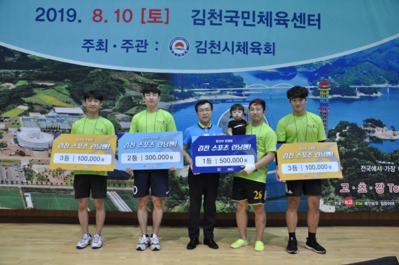 행사 진행은 당초 200명 선착순으로 진행하려 하였으나, 참가 신청이 650명을 육박할 정도로 인기가 좋아서 인원을 대폭 늘려 최종 106팀, 300여명이 참가한 가운데 2∼4명이 팀을 이뤄 종합스포츠타운 곳곳을 누비며 자이언트 젠가, 물풍선 던져 받기, 낱말 맞추기, 신발양궁, 야구공 던지기 등 열띤 게임을 펼친 결과, 최종 우승팀은 대구에서 온 식당 주인과 종업원이 한 팀을 이룬 정식이와 아이들팀이 차지하여 우승상금 오십만원과 함께 첫 김천 스포츠 런닝맨을 차지하는 영광을 누렸다. 2위팀은 홍꿍팀, 3위팀은 앗살라말라이꿈과 아자잣팀이 차지했다.