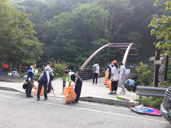 지난 10일 김천시 청렴감사실 직원들은 폭염에도 불구하고 해피투게더 김천 운동 실천의 일환으로 피서철 쓰레기로 몸살을 앓고 있는 증산면 수도계곡 일대를 찾아 자연정화 활동을 전개하였다.