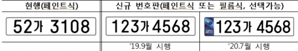 우리나라 자동차 등록대수가 지난해 말 2천300만대를 넘어 섬에 따라 현행 7자리 번호체계(비사업용 승용차)로는 등록번호 용량이 포화상태가 되어 번호체계를 8자리로 개편하게 되었으며, 이를 통해 총 2억 1천만개의 등록번호가 추가 확보되어 반영구적으로 사용할 수 있게 된다.