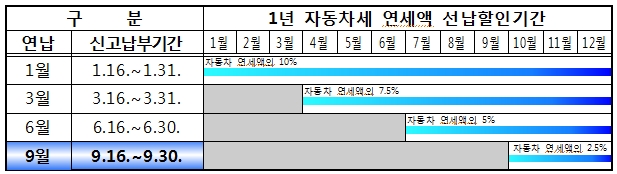 연납구분에 따른 신고납부기간과 선납할인기간은 다음과 같고, 연납을 납부할 경우 다음해 1월에 별도의 신청 없이도 연납고지서를 받을 수 있다.