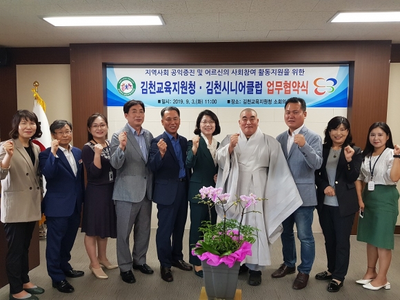 | 경상북도김천교육지원청(교육장 마숙자)은 김천시니어클럽(관장 이동근)과 지난 9월 3일 김천교육지원청 2층 소회의실에서 지역사회 공익증진으로 어르신의 교육시설 봉사 및 전통장담그기 체험을 위한 업무협약을 체결했다