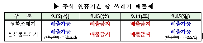 김천시 관계자는 “깨끗하고 쾌적한 추석명절을 보낼 수 있도록 쓰레기 관리에 만전을 기할 것” 이라며 “시민들께서도 연휴기간 동안 쓰레기 수거 일정을 확인해 배출해 주시기 바란다”며 협조를 당부했다. |
