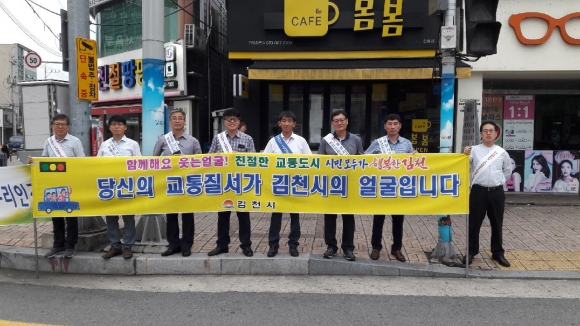 | 김천시는 9월 6일(금) 출근길에 1시간 동안 신음동 이마트사거리에서 모범운전자연합회, 김천경찰서 등 관계자 30여명과 함께 「Happy Together 김천」운동 및 교통법규 준수 및 안전의식 제고를 위한 캠페인을 실시하였다.